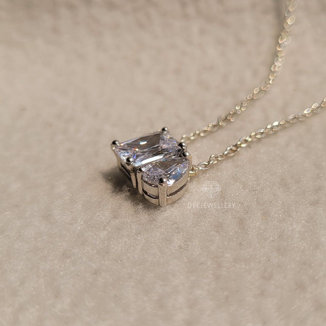 This ring show in picture is Round Cut toi-et-moi style moissanite pendant. Featuring a brilliant 7.7x5.5 mm radiant cut 1.5 ct with 8x5 mm pear cut 1 ct moissanite Pendant. Crafted in your choice of 925 Sterling Silver or 14K Solid Gold.